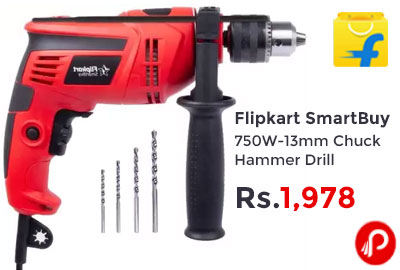 Flipkart is offering Flipkart SmartBuy 750W-13mm Chuck Hammer Drill (13 mm Chuck Size, 750 W) at 1,978. 750W Hammer Drill, 4 Bits, 1 Key, 1 Auxiliary Handle and Operator’s Manual.Machine Washable, Water Resistant.