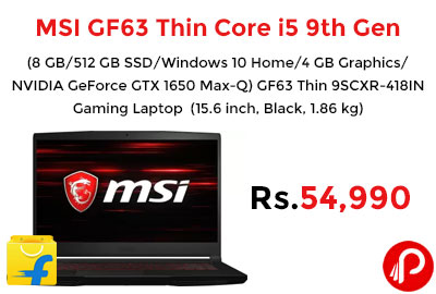 Flipkart is offering MSI GF63 Thin Core i5 9th Gen – (8 GB/512 GB SSD/Windows 10 Home/4 GB Graphics/NVIDIA GeForce GTX 1650 Max-Q) GF63 Thin 9SCXR-418IN Gaming Laptop (15.6 inch, Black, 1.86 kg) at 54,990.